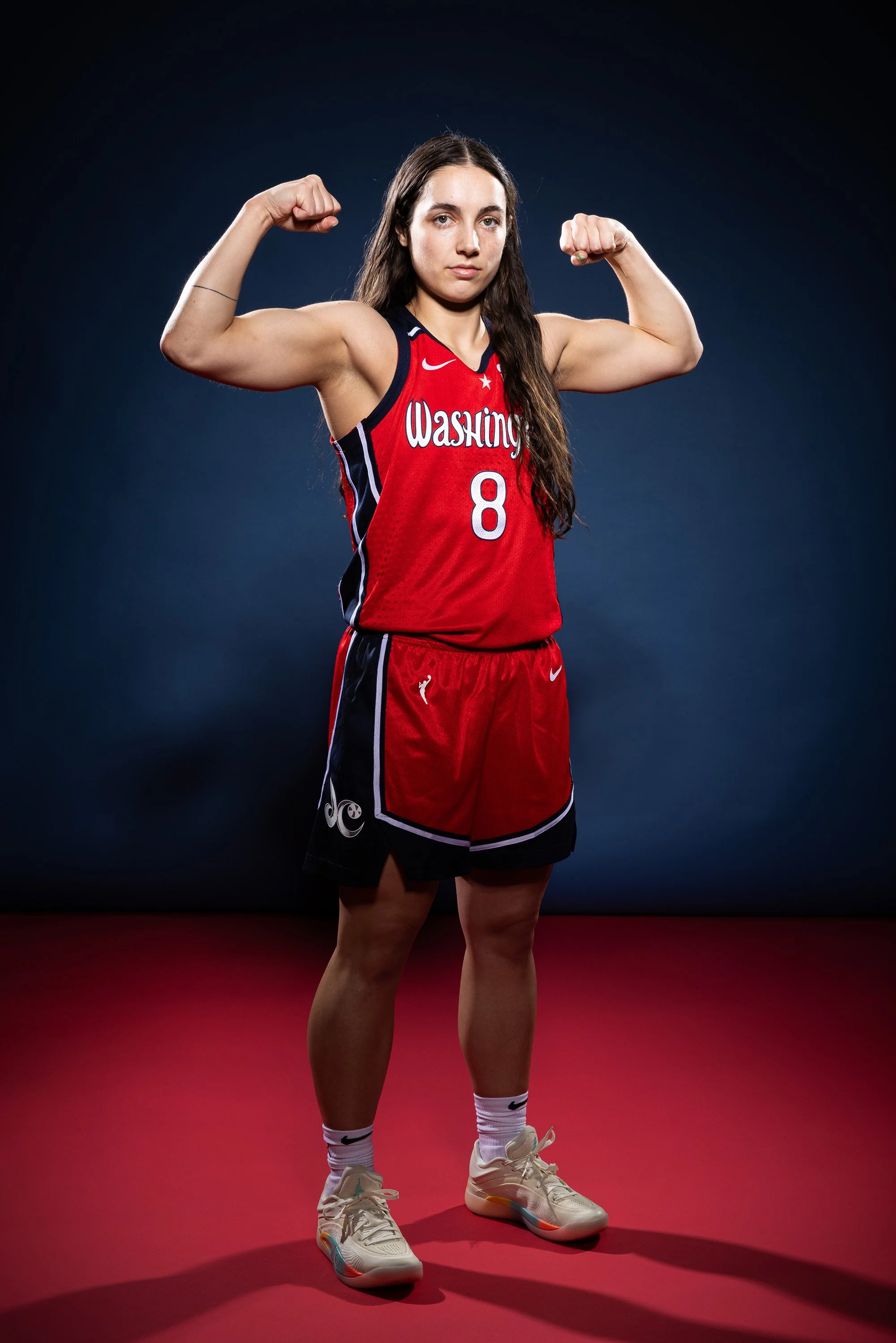 A female basketball player from Washington Wizards team holding a basketball, smiling, wearing a red and black uniform with the number 8, standing on a red and dark background. Washington DC Editorial and Commercial Portrait Photographer. View fullsize